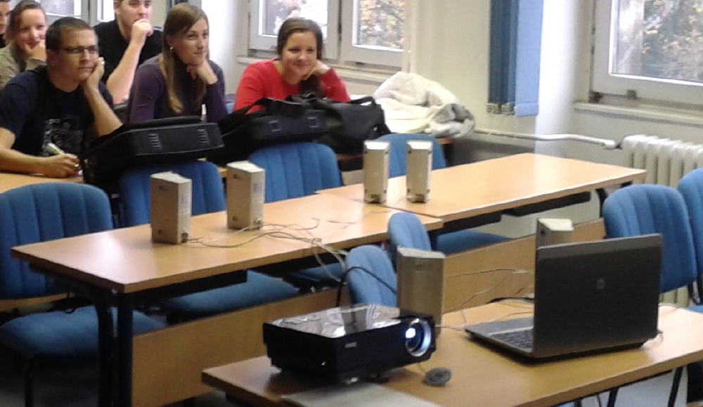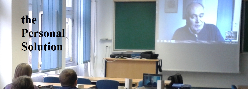 The picture shows my personal solution mathing to my conditions. It is based on Skype version 6. that allows screen-sharing in normal session, and the help of my PhD student. He connected his laptop to the Internet in the classroom and adjusted a projector to the machine - as it had been usualy done in every traditional class presentation. The only extras were the loudspeakers connected to the laptop. I called him in Skype and after the connection my projected picture appeared on the wall screen and my greeting words were load enough to fill up the classroom thanks to the loudspeakers. On my screen at home I could see the students in the benches since the laptop camera was directed to them. After greetings I turned to the screensharing mode of Skype and started my lecture. Still I could monitor the class in the small window shown the picture of the remote laptop camera.